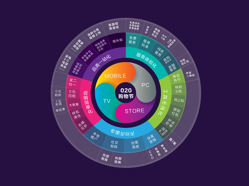 由此可见如今的双十一不再是阿里一个人的狂欢,从传统行业转型互联网零售的苏宁,正在O2O商业模式快速发展的今天,对阿里的平台模式造成巨大威胁,此番抢跑双十一的苏宁O2O购物节无论在活动时长、活动力度、 参与商户、覆盖地域和广告投放力度上,均与阿里系的双十一形成了针锋相对的对垒态势。
